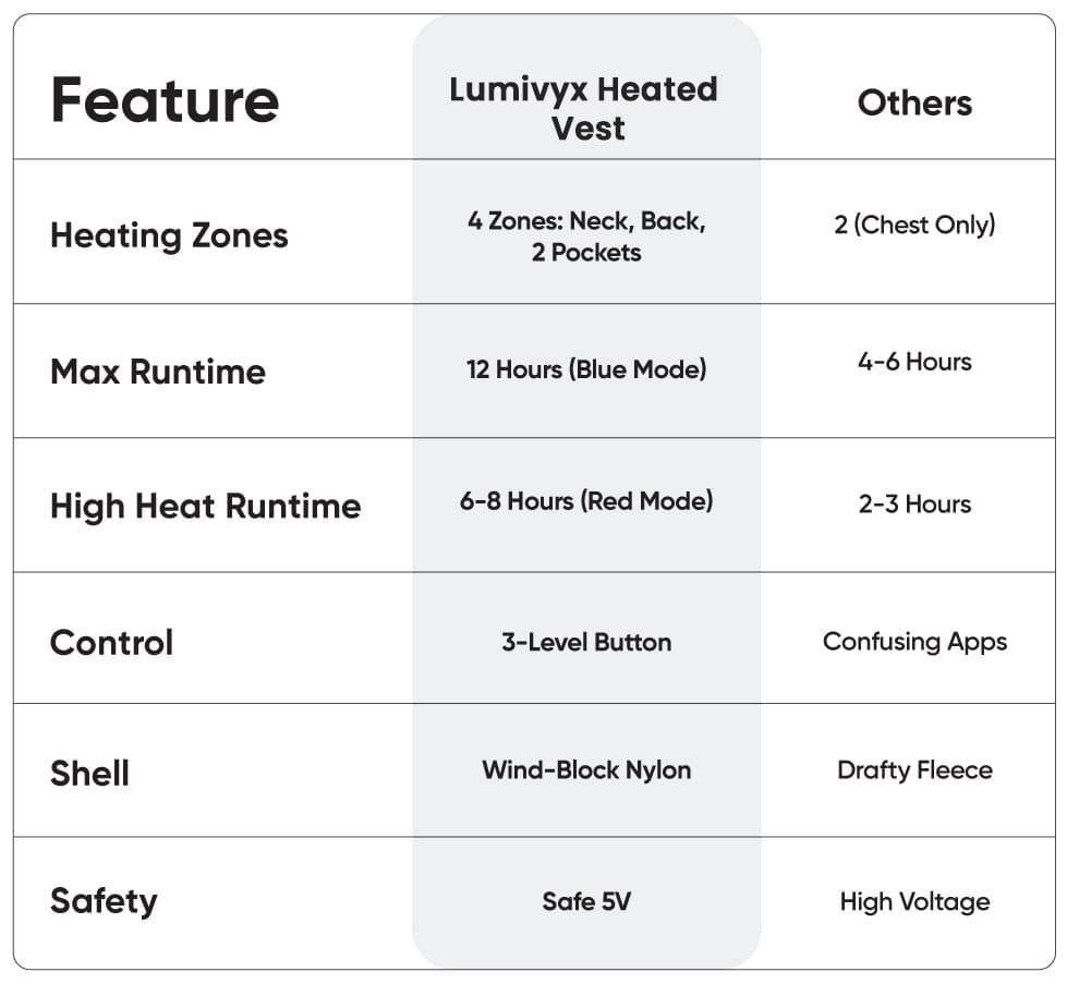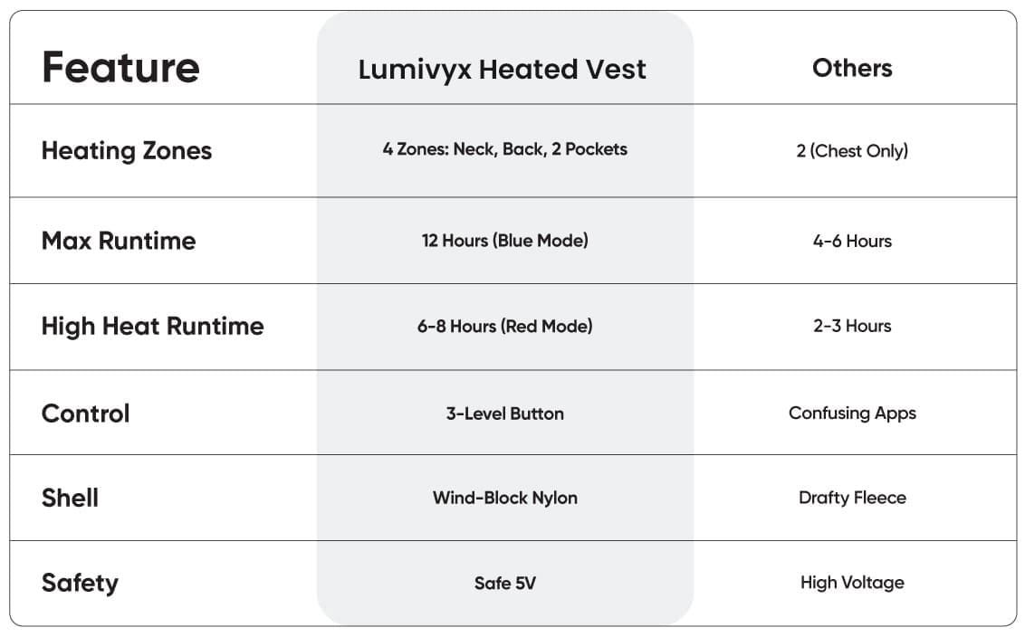 We aren’t an extreme sports brand. We are a wellness brand. Lumivyx Heated Vest uses safe, low-voltage (5V) technology designed specifically for daily wear. It’s gentle, consistent warmth you can trust.