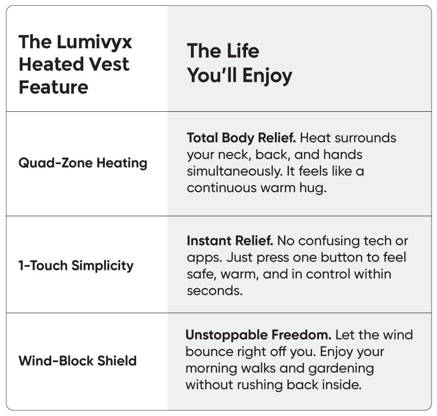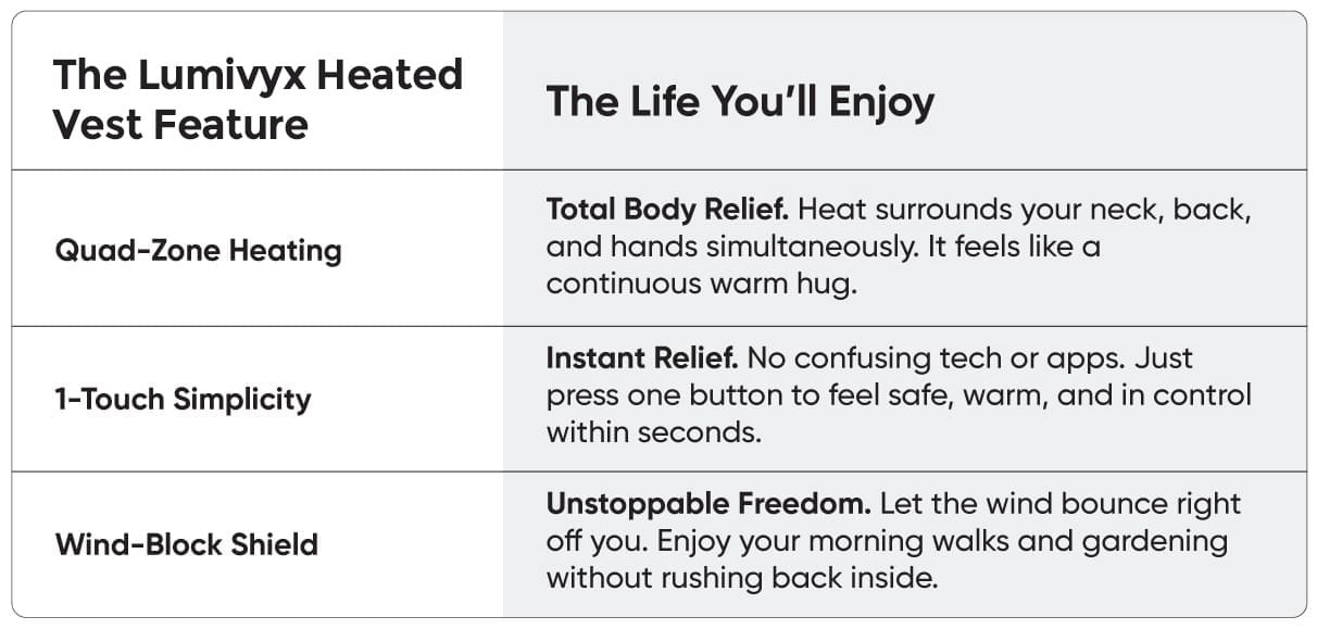 As we age, our metabolism slows down, making it harder to stay warm naturally. Lumivyx Heated Vest solves this instantly. It’s not just a vest; it’s a "warm hug" engineered to target the parts of your body that freeze first.